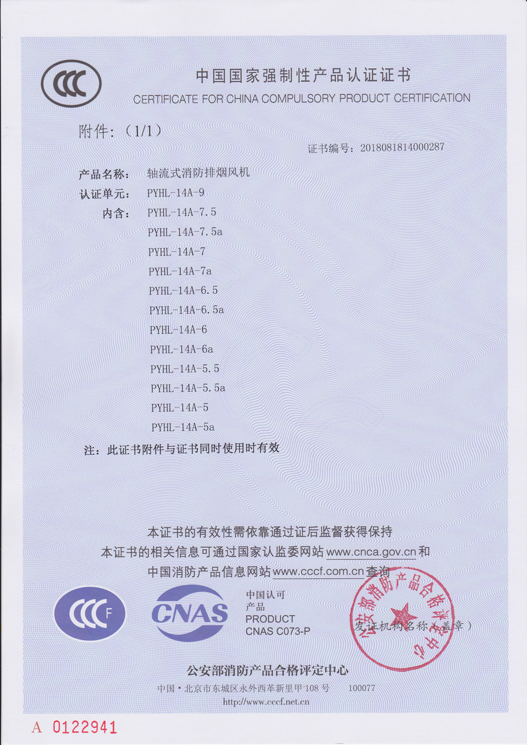 軸流式消防排煙風機PYHL-14A-9(分型)消防3C認證證書