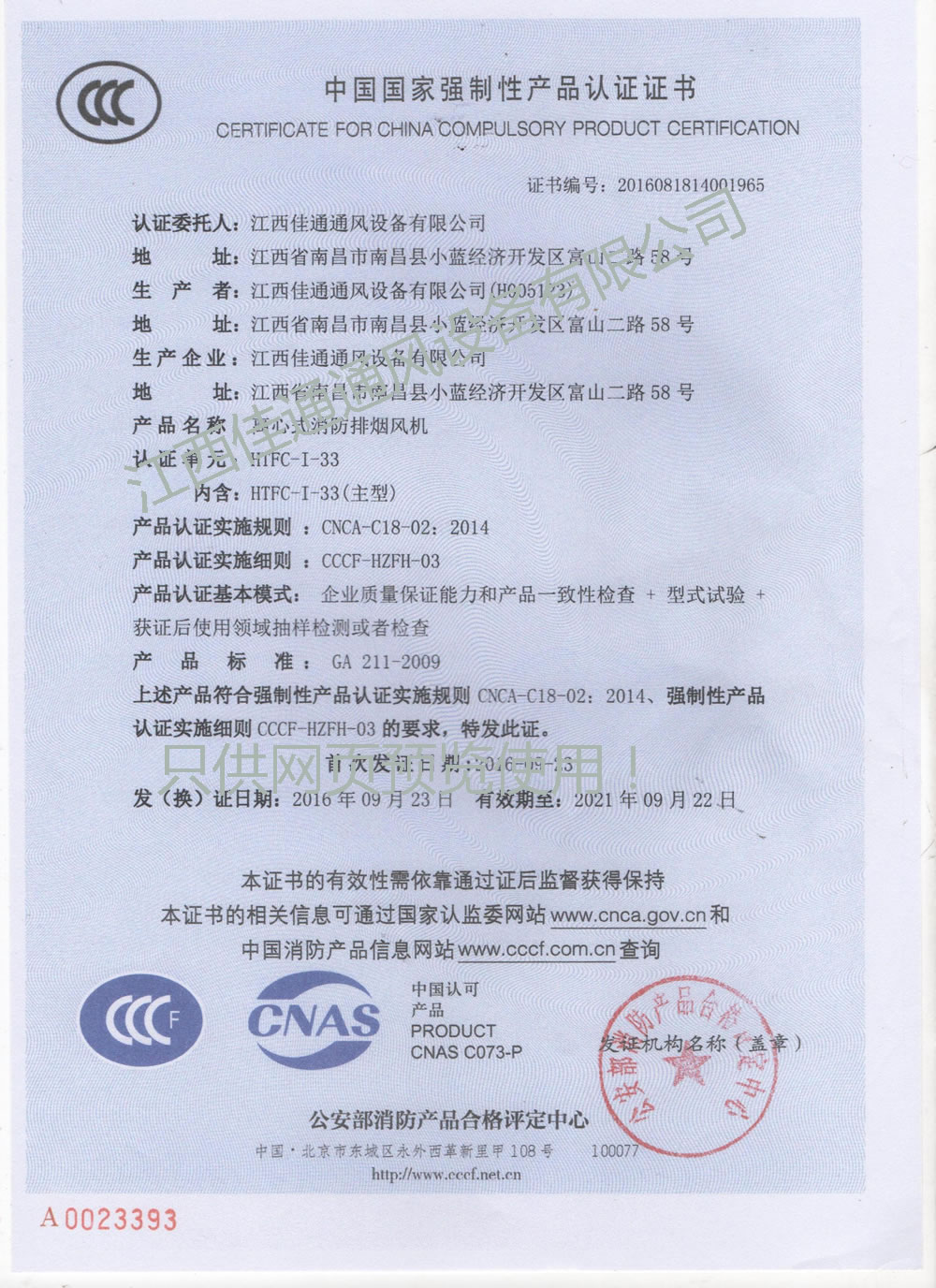 HTFC-I-33離心式消防排煙風機3C認證證書