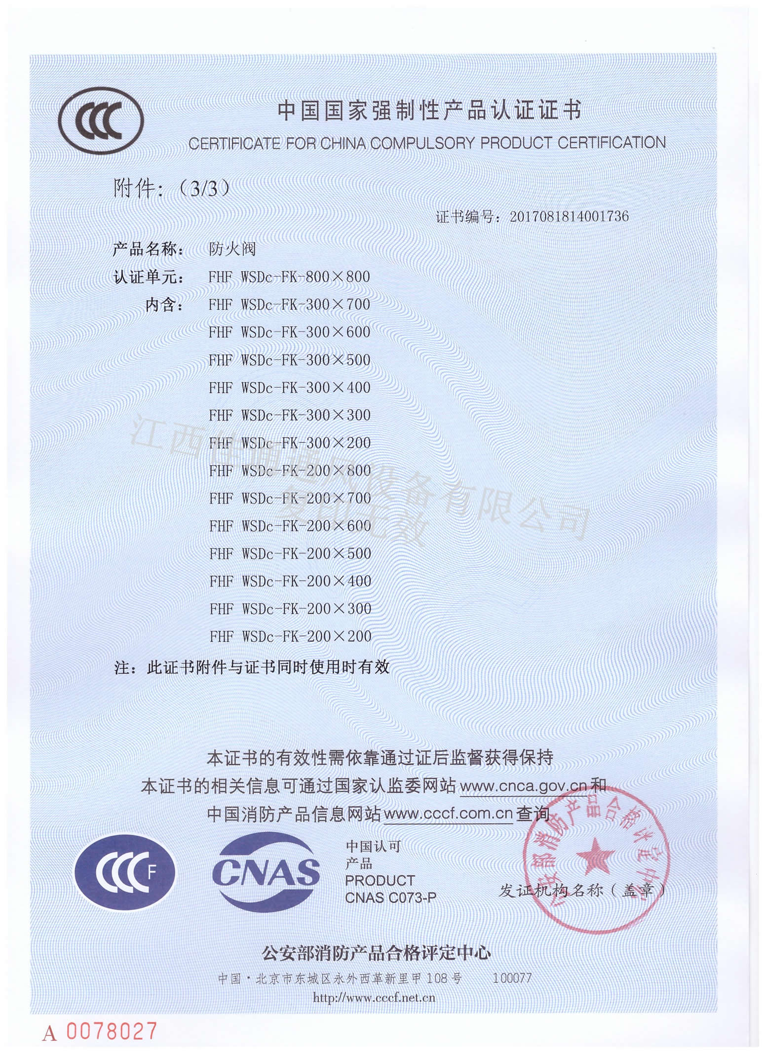 消防3C認證證書防火閥800×800(分型3)