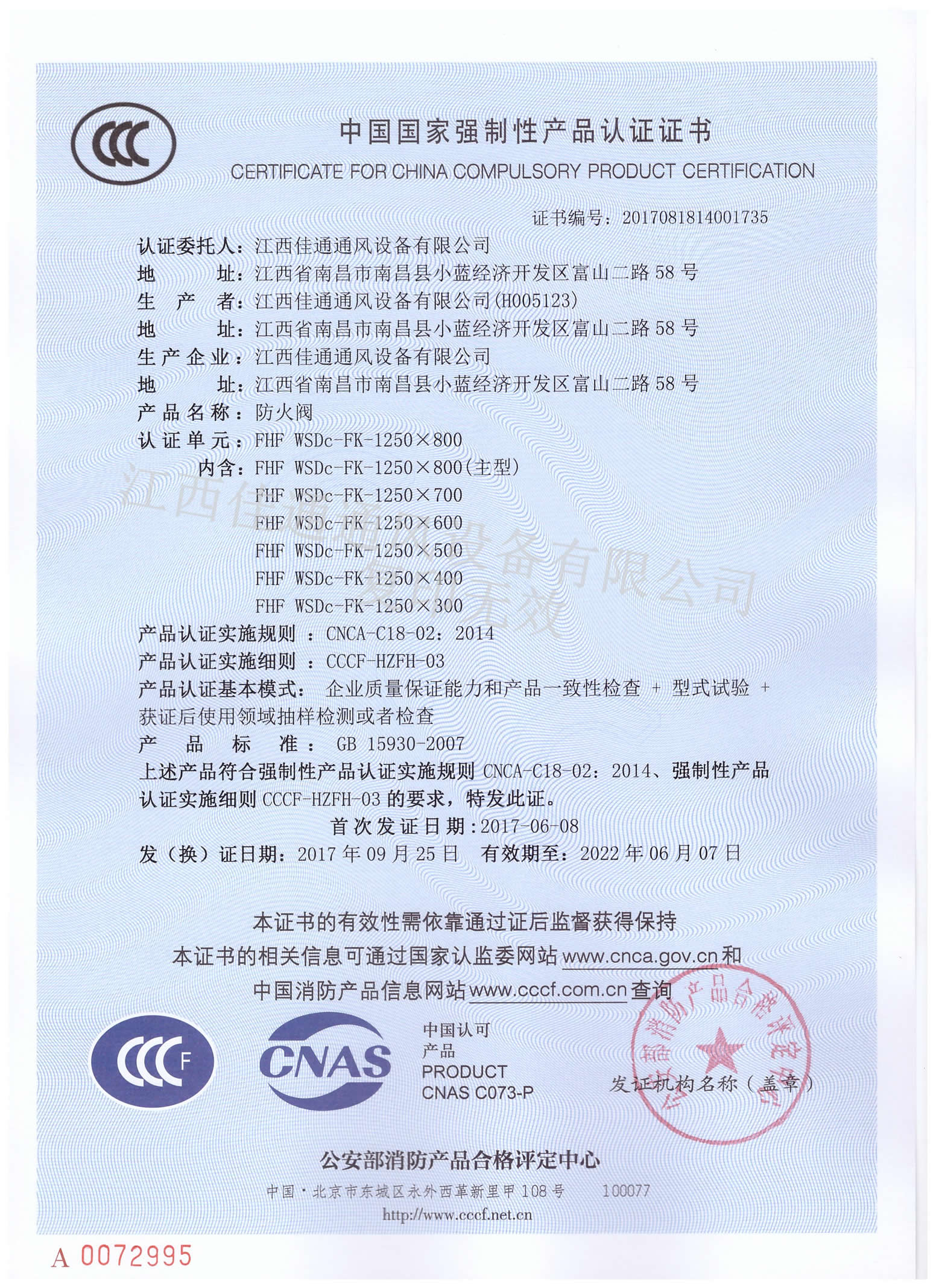 想了解更多請點擊===>>防火閥3C認證證書 3C防火閥 防火閥