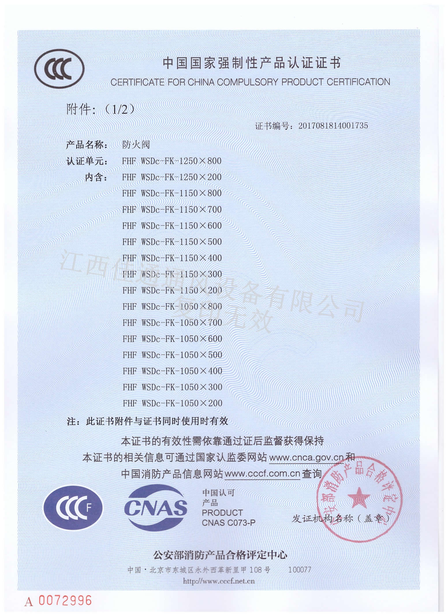 消防3C認證證書防火閥1250×800(分型1)