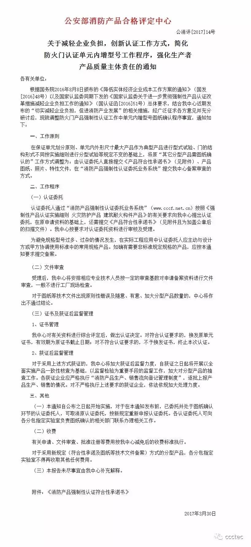 關于減輕企業負擔,創新認證工作方式,簡化防火門認證單元內增型號工作程序,強化生產者產品質量主體責任的通知