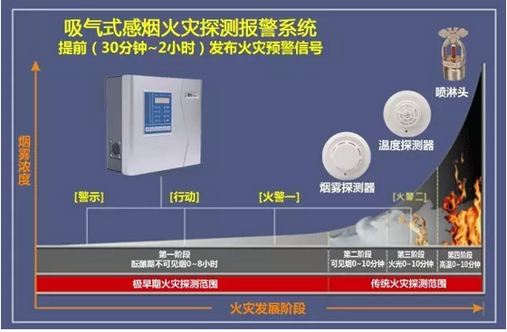 火災(zāi)的發(fā)展分為四個(gè)階段:萌芽(不可見煙霧)、可見煙霧,火焰和高熱階段。上圖表示了在一定時(shí)間內(nèi)火災(zāi)的不同發(fā)展階段。注意在火災(zāi)在萌芽期的醞釀階段提供了更多的時(shí)間與機(jī)會(huì)來探測(cè)并控制火災(zāi)的發(fā)展。