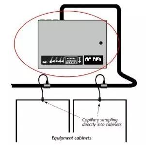 典型的吸氣式感煙火災(zāi)探測(cè)器的安裝方式,所有盤內(nèi)的空氣樣品透過軟管匯流到采樣管送到探測(cè)主機(jī)進(jìn)行煙霧檢測(cè),利用管路及軟管抽取機(jī)柜內(nèi)部的空氣進(jìn)行分析。