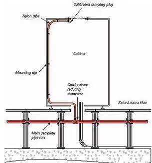 吸氣式感煙火災(zāi)探測(cè)器的采樣管路配置相當(dāng)靈活,采樣管可以配置在機(jī)柜上方,利用軟管及機(jī)柜上方的開孔即可抽取機(jī)柜內(nèi)部的空氣。采樣管路也可以配置在機(jī)柜下方,利用軟管延伸到機(jī)柜內(nèi)部的頂端來抽取空氣樣本。