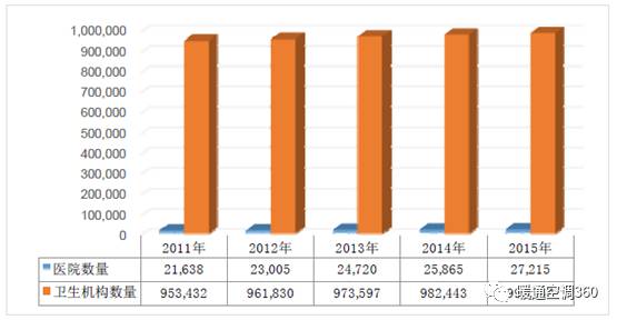 隨著城鎮化建設的推進以及人民生活水平的提升,人們對衛生醫療方面的需求不斷提升,各大醫院人滿為患。公共衛生醫療機構作為特殊公共場所,對室內空氣環境的要求很高,中央空調系統是現代醫院不可缺少的重要組成部分。根據國家統計局近五年數據顯示,截至2015 年底,全國醫療衛生機構數達990,248 個,其中:醫院27,215 個。與2014 年相比,全國醫療衛生機構增加7,805 個,其中:醫院增加1,350 個。醫院數量的不斷增長加大了對中央空調產品的需求量。