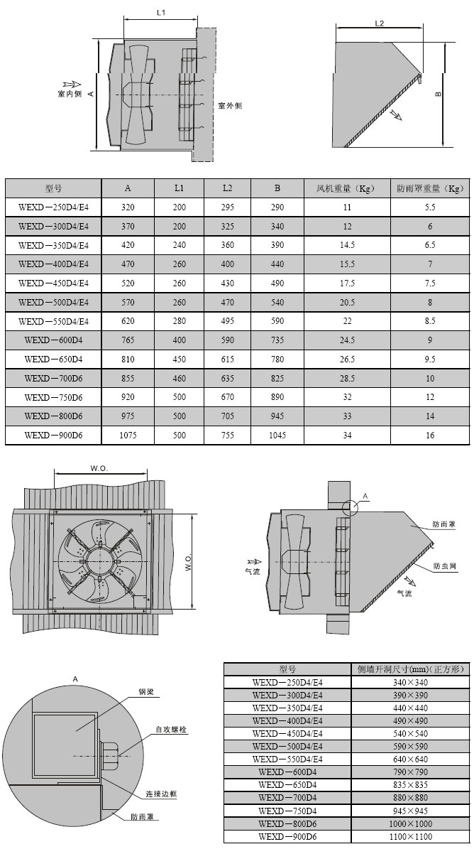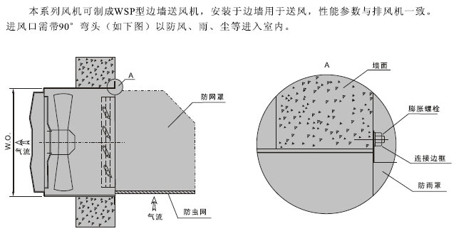 DWEX邊墻風(fēng)機又叫WEX邊墻風(fēng)機,其采用先進的前掠型葉片、低噪音的外轉(zhuǎn)子或內(nèi)轉(zhuǎn)子風(fēng)機專用電機直聯(lián)傳動,方形外殼設(shè)計可以方便地安裝在混凝土墻、磚墻或輕鋼壓型墻板上,方形防雨罩結(jié)構(gòu)牢固,外形美觀。具有噪聲低、風(fēng)量大、運行可靠、性能參數(shù)范圍廣、安裝簡便等特點。根據(jù)輸送介質(zhì)的要求,可制成防腐、防爆型。 DWEX(WEX)系列風(fēng)機一般用于邊墻壁式排風(fēng),配設(shè)45°防雨罩(或特殊制造成60°)和防蟲網(wǎng)(夜間可防止昆蟲循燈光飛入車間)??砂葱枰瞥蛇厜λ惋L(fēng)機型號為DWSP(WSP),配設(shè)90°防雨罩(防風(fēng)、雨、塵)和防蟲網(wǎng)(夜間可防止昆蟲循燈光飛入車間)。