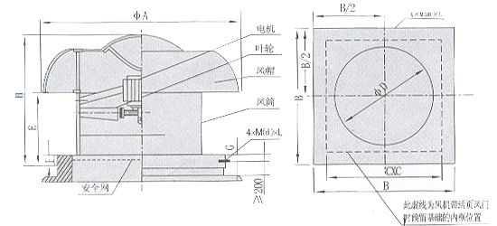b、離心式屋頂風機:代號為DWT-II,型、DWT-III型二種型式,適用于風量較小而壓力要求較高的場合。