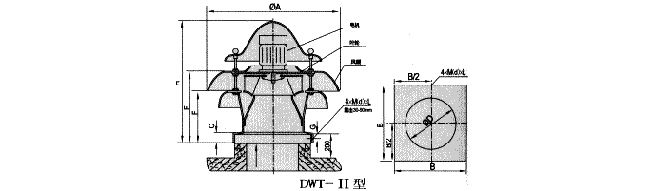 b、離心式屋頂風(fēng)機(jī):代號(hào)為DWT-II,型、DWT-III型二種型式,適用于風(fēng)量較小而壓力要求較高的場(chǎng)合。