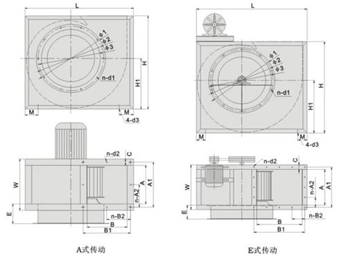 本系列風機分為A式直聯傳動和E式皮帶傳動,按葉輪旋轉方向為左旋和右旋,旋轉方向從電機或皮帶輪側看為準,以出風口分為0 °、90 °、180 °、270 °四種出風方式,訂貨時需注明。